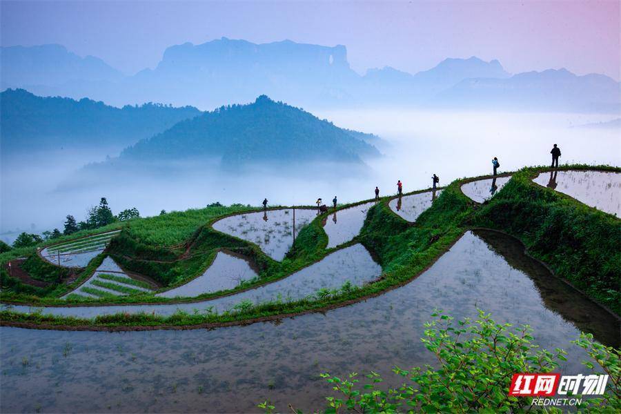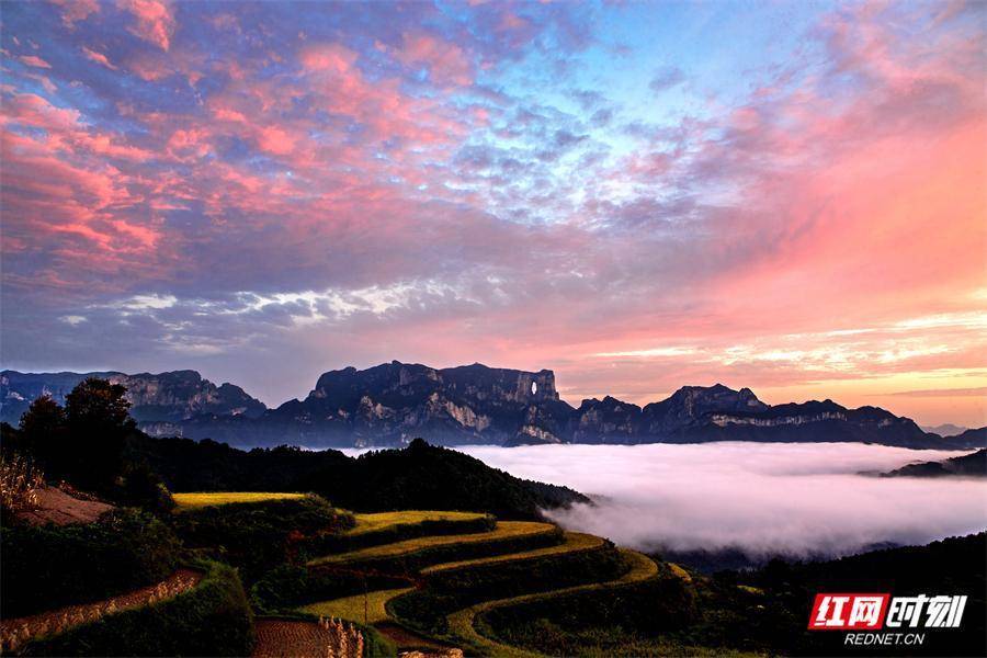 霞光中的堡子界堡子界的自然风光令人叹为观止。与天门山、七星山直线距离约6公里,使其成为远观这两座名山奇美风景的绝佳位置。站在堡子界的高处,天门山的巍峨险峻、七星山的神秘莫测尽收眼底。运气好时,还能看到云雾在山间缭绕,群峰和天门洞在云海中若隐若现,如梦似幻,宛如一幅绝美的山水画卷。踏入林场,梯田、竹林、瀑布、云海等美景依次映入眼帘。层层叠叠的梯田,线条优美,不同于云贵梯田的大气磅礴,这里的梯田更多了几分南方的温婉秀丽,与周边的青山绿水相互映衬,勾勒出田园牧歌般的景致。沿着蜿蜒的山路前行,茂密的竹林沙沙作响,仿佛在演奏着一曲自然的乐章,为燥热的夏日带来丝丝清凉。而隐匿在山林深处的瀑布,从高处倾泻而下,水花飞溅,轰鸣声在山谷间回荡,让人感受到大自然的雄浑力量。当云海翻腾时,堡子界仿佛置身于仙境之中,行走其间,如临九霄之上,飘飘欲仙。堡子界早年名为诸鱼山,因其主峰海拔1300多米,山脊突兀好似堡垒,故而得名。这里还有着另一番迷人景象,左手边是层层梯田,右手边是悠悠浮云,乡村田园风光与壮阔林海景观相得益彰。沿着盘山路蜿蜒而上,一路上的梯田与葱郁灌木交织,与雄伟的天门山遥遥相望,也正因如此,堡子界素有“天门山后花园”的美誉。登上界顶,天门山群峰和天门洞毫无保留地展现在眼前,尤其是在云海时节,景色更是美不胜收。